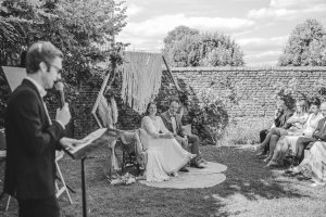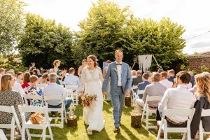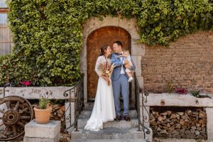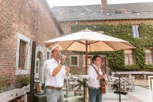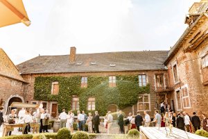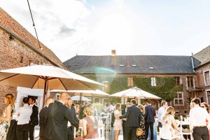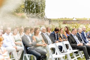 In de ochtend kwamen Marlies en Wouter aan in de prachtige vierkantshoeve van het Goed van Gothem. Ze maakten zich klaar in de suites samen met de bruidsmeisjes. Vlak voor de ceremonie gaven ze elkaar de ‘first look’. De ceremonie vond plaats in de zonnige tuin.